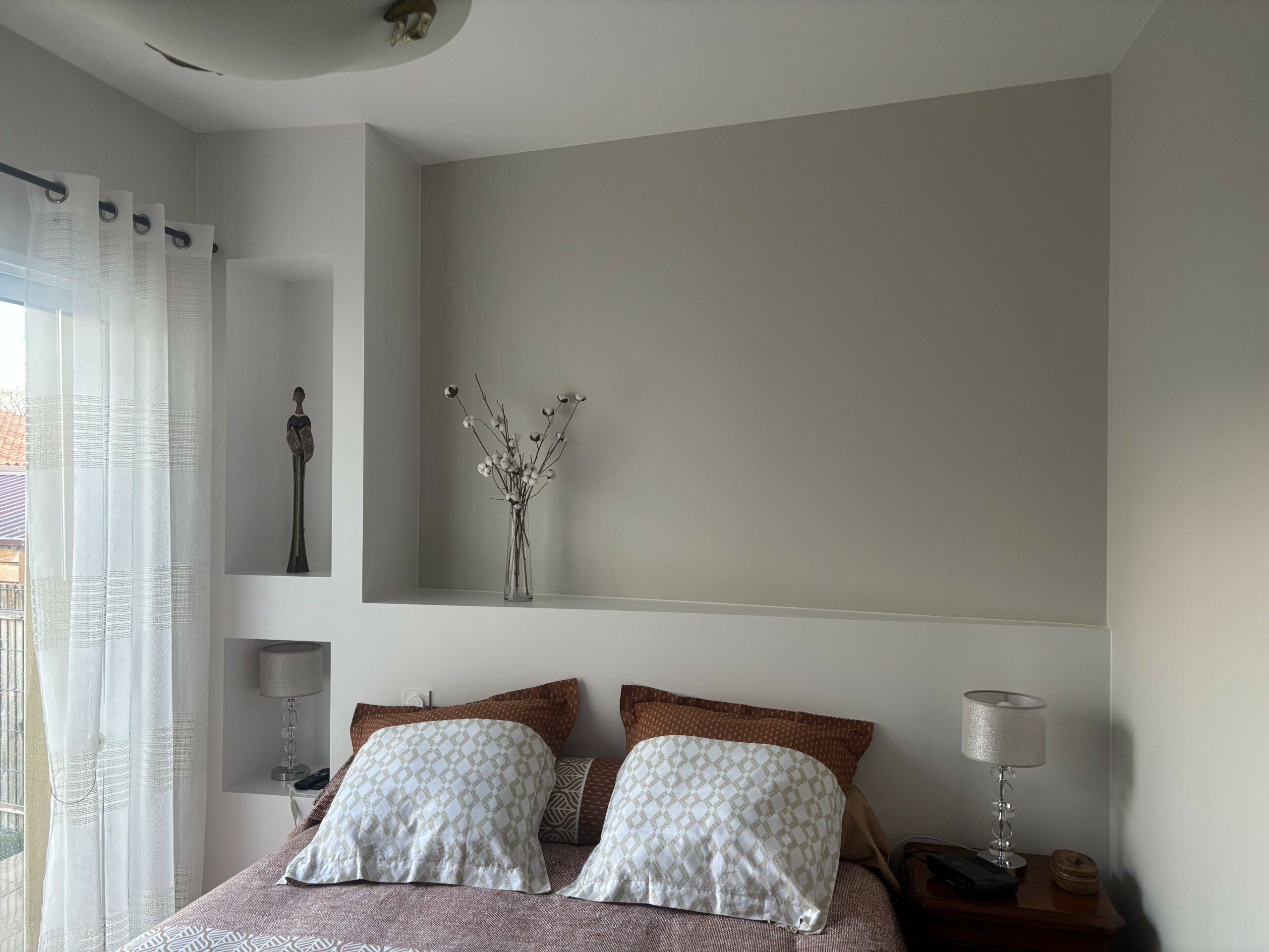 Après la pose des panneaux, j’ai réalisé leur mise en peinture dans une teinte chaleureuse, parfaitement en harmonie avec l’ambiance naturelle de la chambre et les éléments bois présents dans la pièce.