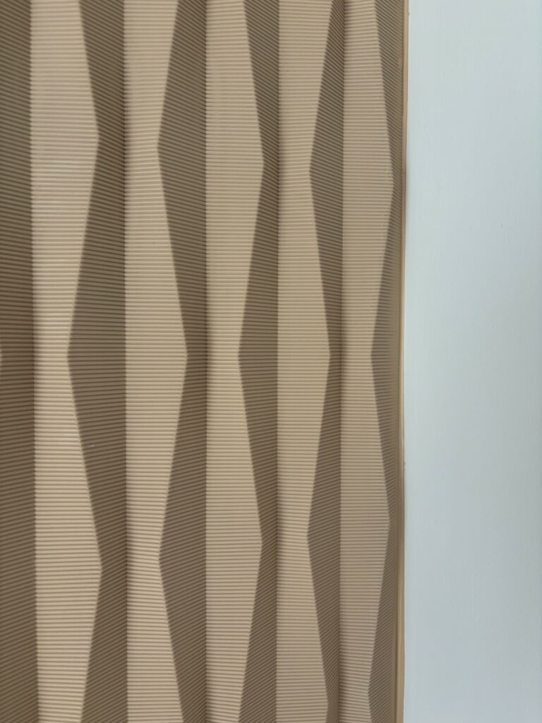 Grâce aux panneaux 3D, le mur devient un point focal dans la chambre. Le relief apporte du caractère et renforce l’atmosphère douce, élégante et chaleureuse de la pièce.